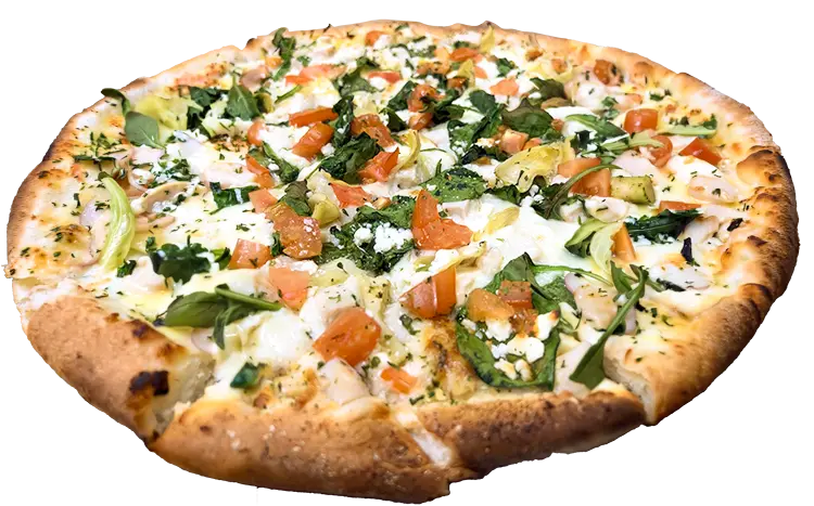 Garlic Base Sauce, Grilled Chicken, Mozzarella & Provolone, Topped With Spinach, Artichoke Hearts. Feta Cheese, Diced Tomatoes